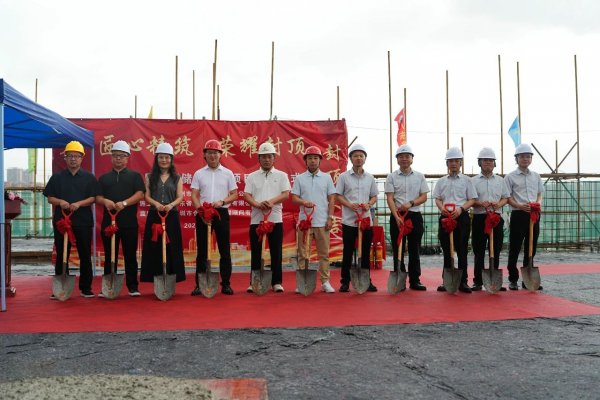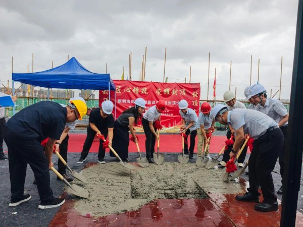 上午8时45分,吉时已至,封顶仪式在项目现场隆重举行。现场彩旗飘扬,礼炮齐鸣,气氛热烈非凡。建设单位:惠州市新明海科技有限公司常务副总雷健华、建委领导及公司高管、设计单位:奥意建筑设计工程有限公司:王为总、监理单位:深圳市合创建设工程顾问有限公司项目总监尚文飞、施工单位:广东省惠湾建安工程有限公司总经理:陈誉升及公司高管等共同挥动金锹,为项目主体结构浇筑混凝土,标志着项目建设取得了阶段性的胜利。