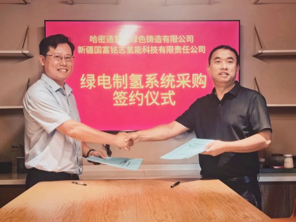 2025年8月18日,国富氢能全资控股公司新疆国富铭志氢能科技有限责任公司(以下简称 “国富铭志”)与哈密通慧德绿色铸造有限公司(以下简称 “哈密通慧德”)在哈密正式签订采购合同,双方就氢能核心装备采购达成深度合作,标志着国富氢能电解制氢技术在西北工业场景的规模化应用迈出关键一步。